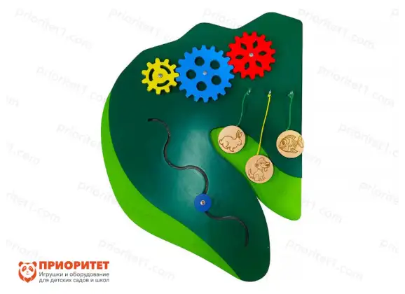 - Под правой шестеренкой вкручены 3 металлических крючка, к которым за веревочки привязаны деревянные круглые медальоны с изображениями кролика, собаки и рыбки. Дети на ощупь изучают форму правильного круга и запоминают вид и названия животных, а также пробуют переплетать веревочки между собой и завязывать узлы, развивая при этом координацию и тренируя мышцы пальцев рук, подготавливаясь к письму в школе.