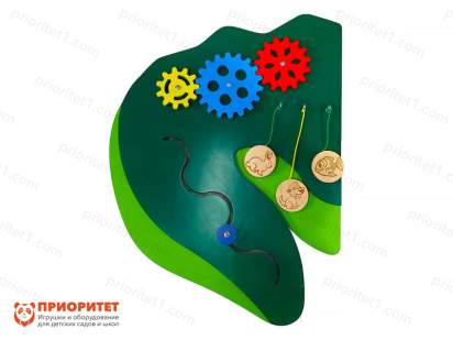 Основа модуля выполнена в виде хвоста большого крокодила и окрашена в приятный зеленый цвет. Элементы модуля дополняют общую картину и привлекают детей к игре. Гладкая поверхность основы модуля обогащает тактильное восприятие малышей и дарит приятные ощущения от прощупывания каждой его части. Модуль не содержит острых углов и выпирающих опасных деталей, поэтому заниматься малышам с ним безопасно.