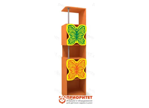 С помощью этой стенки вы сможете удобно организовать любые вещи – игрушки, литературу, использовать стенку как стенд для различных материалов. Она отлично подойдет для использования в детском саду. Модульная конструкция позволяет разместить стенку в нескольких вариациях, удобно и практично подстроив ее под интерьер группы, а также конкретные задачи. Яркое оформление и большие красочные бабочки создадут позитивно настроенную атмосферу и привлекут внимание детей. Приучайте малыша к порядку и ответственности за личные вещи в непринужденной форме.