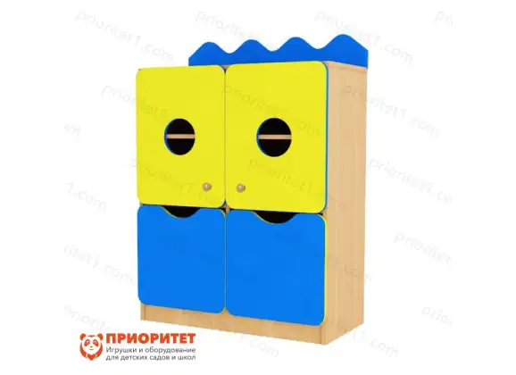 Сдвоенный модуль «Катерок» занимает немного места в помещении, но способен заменить целый шкафчик. Расцветку под натуральное дерево, которая могла бы казаться скучной в детской мебели, компенсируют необыкновенные формы изделия. Параметры этого модуля равны — 80 см в ширину, 40 см в глубину и 121 см в высоту.