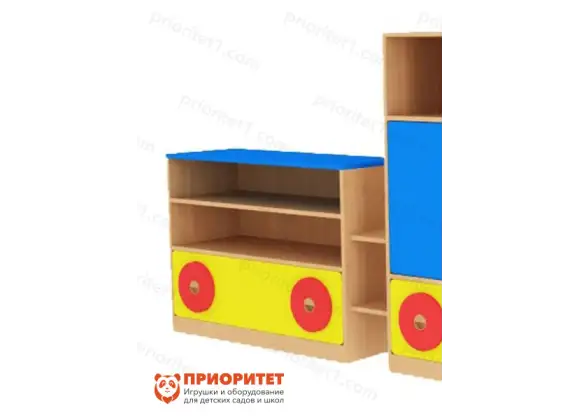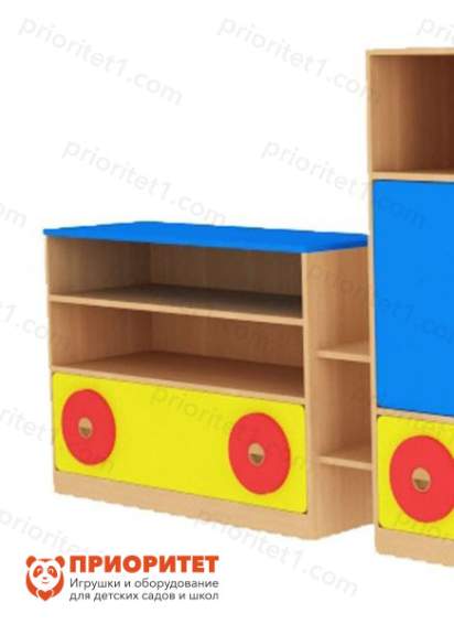 Конструкция простая, прямоугольной формы, состоит из открытого стеллажа и выдвижного ящика. Шкафчик устойчивый и компактный, он не нагружает пространство и не занимает много места. На открытых полках можно расположить игрушки. Дети смогут доставать их и складывать на место самостоятельно, а ящик использовать для хранения учебных принадлежностей.