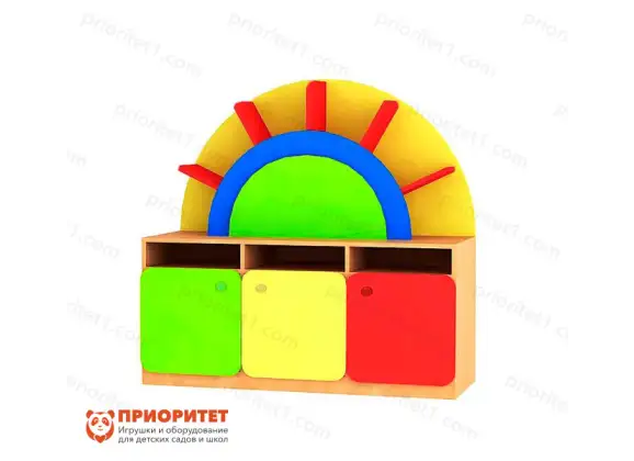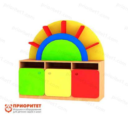 Секция детской стенки "Радуга", состоящая из трех шкафчиков с открытыми и закрытыми отделениями и декора в форме солнышка. Вместе с другими секциями составляет яркий комплект мебели, подходящий для организации гармоничного, игрового и развивающего пространства в помещениях детских дошкольных учреждений.