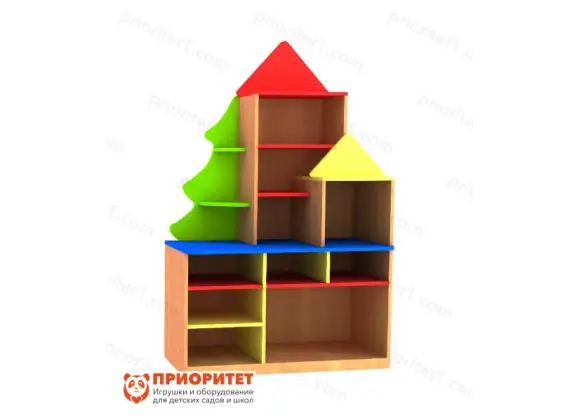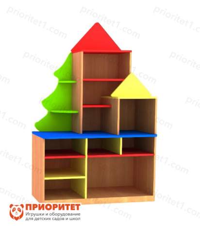 Дизайн у стеллажа нетипичный. Элементы в виде елочки украшают заднюю стенку и некоторые полочки. Яркая цветовая палитра понравится детям. Такой дизайн считается универсальным, так как вписывается в любое пространство детского сада. Все детали мебели тщательно отшлифованы и покрыты гипоаллергенной краской.