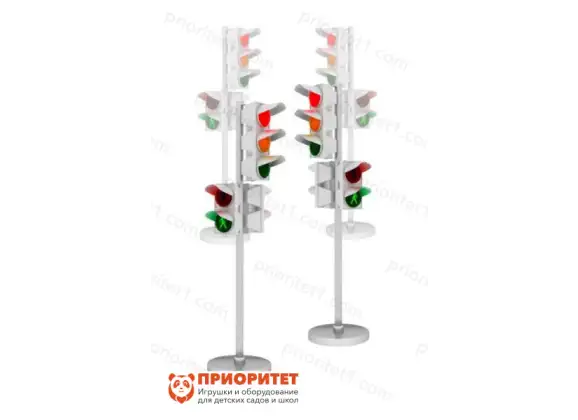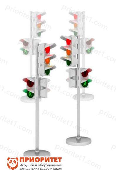 - В набор входят четыре конструкции, изображающие дорожный фонарь. Каждый оснащен двумя светофорами: трехсекционным для автомобилей – красный, желтый, зеленый, и двухсекционных для пешеходов – с двумя человечками.