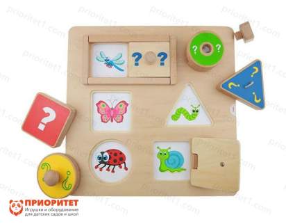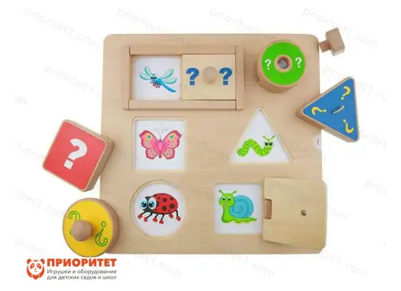 На лицевой части панели расположены шесть “окон”, которые закрываются специальными, подходящими по форме, заслонками. Во время игры ребенку предлагается угадать, что спрятано за формой. Если он правильно угадает - то можно поиграть в соответствующие игры или рассказать, что он знает о том предмете или животном, которое угадал. Одно из “окон” имеет приятный бонус: специальную линзу, в которую можно посмотреть. В комплекте идут сменные листы с различными изображениями. В данную игру можно играть в одиночке, с педагогом, а также компанией из нескольких ребят.