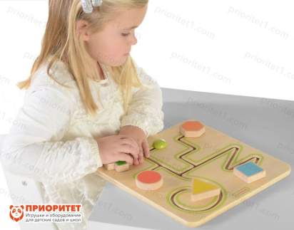 Панель “Загадочный Лабиринт” — это развивающая игрушка для детей от 2-х до 7-ми лет. Изготовлена из натуральной фанеры, с применением безопасных для детей материалов. В фанере выполнены специальные прорези, внутри которых передвигаются бегунки. Бегунки исполнены в виде простых геометрических фигур: треугольник, круг, крест, квадрат и шестиугольник. Игра тренирует ловкость, мелкую моторику, основана на тактильных ощущениях. Чтобы игровой процесс был эффективнее, можно предложить ребёнку пользоваться обеими руками одновременно. Суть подобных лабиринтов в том, чтобы переместить любую фигуру в любое желаемое место.