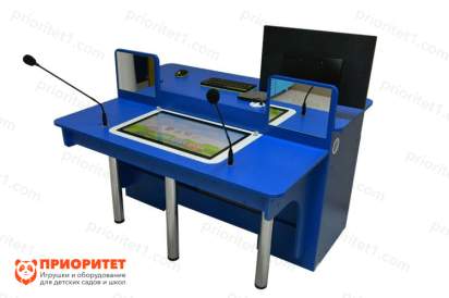 Сам комплекс представлен в виде двух модулей: один для преподавателя, второй для ученика. Первый оснащен монитором в 22 дюйма и акустической системой. Второй характеризуется сенсорным экраном размером в 25 дюймов с технологией Multi Touch System, а также радиосистемой с двумя микрофонами. Встроен современный производительный компьютер. В комплект входит беспроводная клавиатура и мышь.