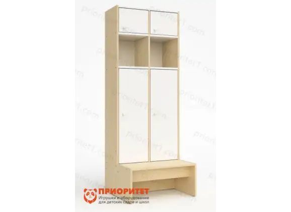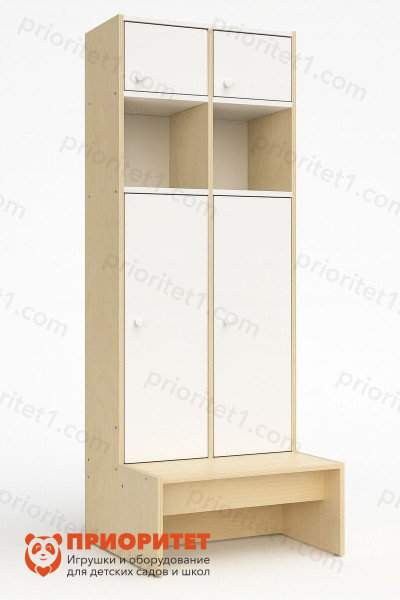 Шкаф-раздевалка 2-х местная закрытая из серии «Медовая» — практичная мебель для оснащения раздевалок в детском саду и начальной школе. Модель рассчитана на 2 ребёнка и помогает организовать персональное хранение одежды и обуви в группе. Каркас выполнен из влагостойкой фанеры, дверцы — из ЛДСП. В комплекте — крючки для одежды и алюминиевая решётка для обуви.