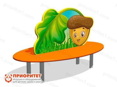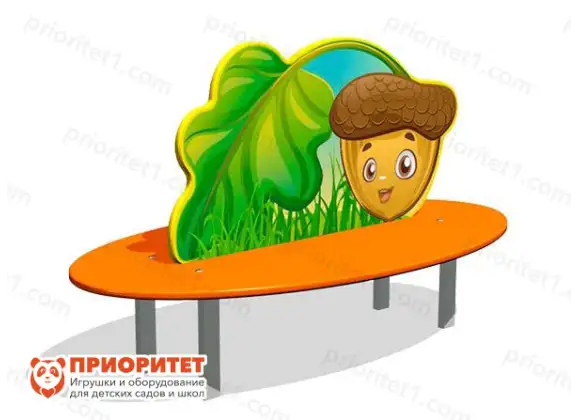 Детская скамейка Желудь украсит любую детскую площадки и создаст для детей уютный уголок отдыха и покоя. Скамейка имеет овальное сидение, окрашенное в оранжевый цвет и спинку, на которой нанесен рисунок дубового желудя с листочком и травой. Скамейка устанавливается на 4 металлических ножках. Все крепежные элементы также, как и края труб закрываются пластиковыми заглушками.