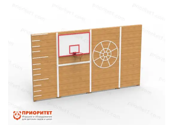 Деревянная стена представляет собой универсальный комплекс для игр и занятий спортом. На стене расположено баскетбольное кольцо, круглая мишень и вертикальная шкала с делениями. Благодаря компактному размеру такую стену можно смонтировать в любом месте, она подойдет для установки у стены дома, на игровой площадке или в спортзале.
