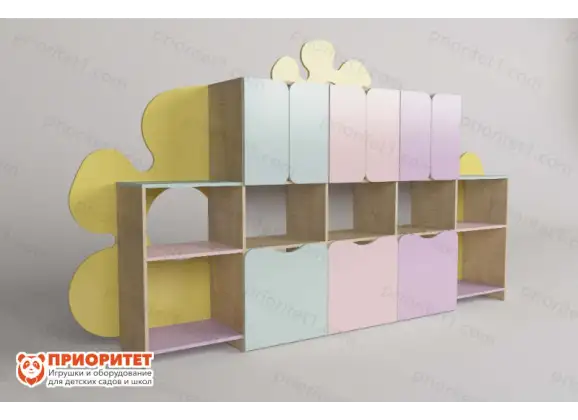 Огромный функциональный стеллаж «Лето» создан специально для оборудования групп в ДОУ. Дизайн мебели привлекательный, пастельные тона не раздражают. Конструкция состоит из открытых секций и шкафов с дверцами. В таком стеллаже можно спрятать игрушки, книжки, пособия, дидактические материалы и другие предметы, предназначенные для развития и воспитания дошкольников.
