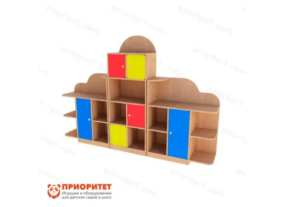 Стеллаж-стенка «Антошка» (цветной фасад) – это крупный комплекс, предназначенный для расстановки и хранения детских игрушек. Представляет собой шкаф из открытых и закрытых полок, на которые раскладывают учебные принадлежности, игрушки или самодельные работы детей.