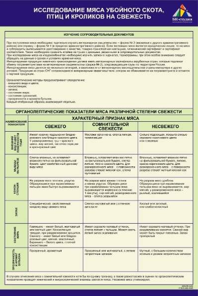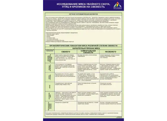Стенд представляет собой комплект из 2 частей, содержащих текстовую информацию по теме «Исследование мяса убойного скота, птиц и кроликов на свежесть».