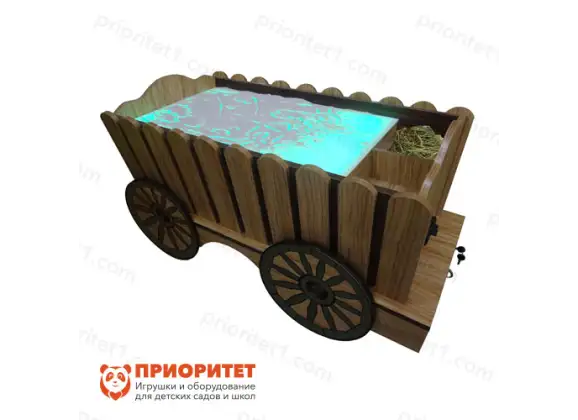 Стол выполнен в виде деревянной телеги. Это делает его интересным элементом интерьера. Поверхность стола оборудована RGB-подсветкой.