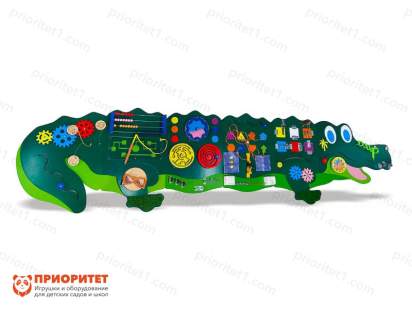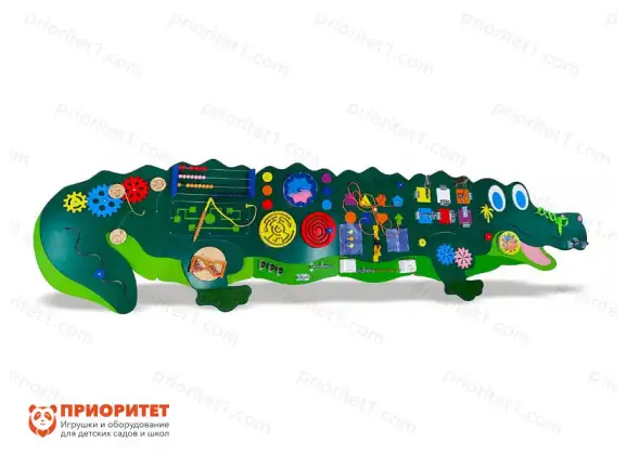Панель состоит из нескольких частей, которые соединяются последовательно друг с другом и образуют целого крокодила. Его улыбающаяся голова приглашает малышей поиграть, а элементы, содержащиеся на каждом модуле, помогают не только весело провести время, но и с пользой. Во время игрового процесса развиваются и интеллектуальные способности, и физические навыки, помогающие сформировать четкий и правильный почерк для школьных работ.