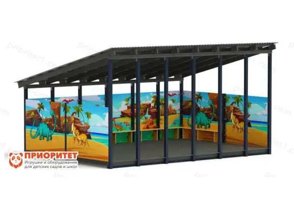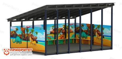 Навес устанавливается на металлических опорах. Стены разрисованы картинками с динозаврами, природой. Пол монтируется на 150 мм выше уровня грунта. Крыша односкатная, со сливом позади навеса.