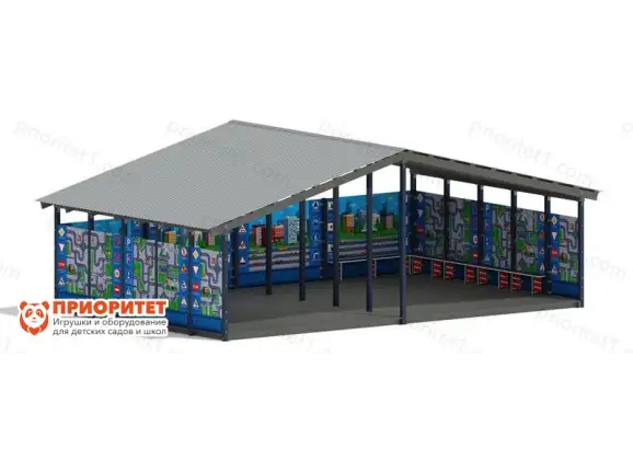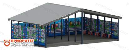 Теневой навес с рисунком «ДПС» на стенах поможет воспитателю проводить прогулки и уроки с детьми даже при неблагоприятной погоде. Навес накрыт двускатной крышей, которая устанавливается на прочных металлических опорах. Стены надежно защитят от воды и ветра. На стенах нанесен яркий и привлекательный для детей рисунок: машины, дома, улицы и шоссе.