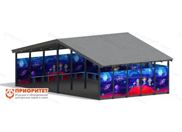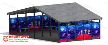 Конструкция навеса разработана таким образом, чтобы дети могли оставаться защищенными от воздействия непогоды, но в то же время продолжить отдых на улице. Внутри навеса установлены скамейки. Стены высокие, закрыты металлическими листами с рисунками космоса на них. Крыша двускатная с наклонами по левую и по правую стороны.