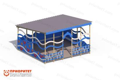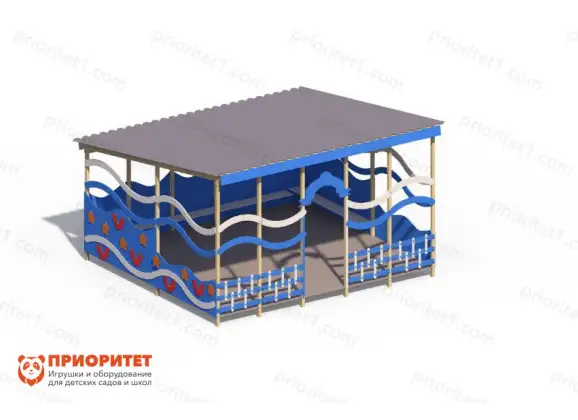 Теневой навес «Морское царство» подойдет для установки на площадке детского сада, либо в парке, во дворе жилого дома, на площадках реабилитационных и коррекционных центров и т.д. Навес защищает от жарких солнечных лучей во время дневных прогулок, а также послужит укрытием в дождливую погоду. Благодаря продуваемым декорированным стенам в сильную жару под навесом не душно.