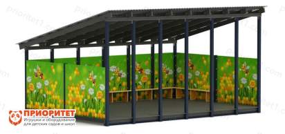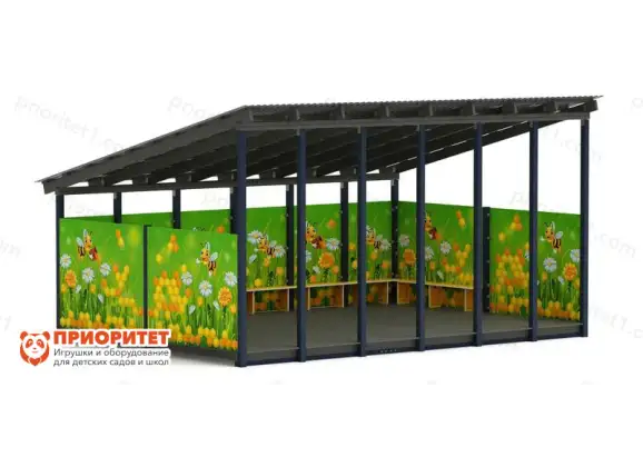 Теневой навес рекомендован для оборудования пришкольных площадок и дошкольных учреждений. Он гармонично дополняет экстерьер и создает оптимальные условия для игры и отдыха малышей. Конструкция из прочной крыши и стен спрячет малышей от жаркого солнца и не даст ветру или дождю испортить прогулку. Пространства под навесом хватит для проведения активных подвижных игр, а на маленьких скамейках вдоль стен малыши смогут расположиться для отдыха.
