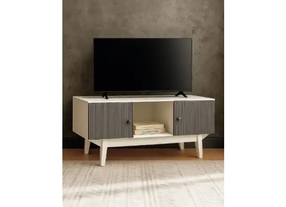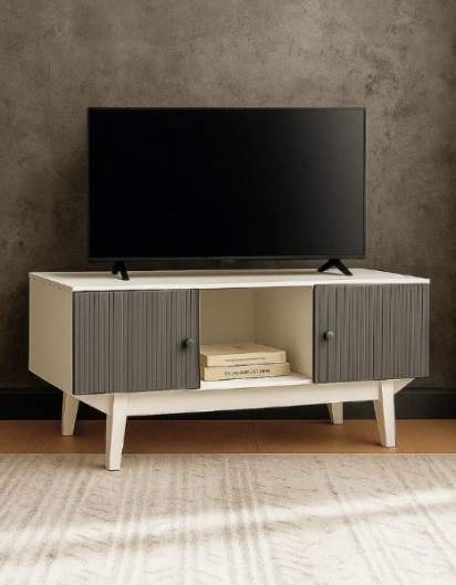Дизайн: Фасады шкафов выполнены в сером цвете с вертикальной текстурой, что добавляет глубины и визуального интереса. Корпус и ножки — в белом цвете, создают ощущение лёгкости и чистоты. - Конструкция: Два закрытых шкафа с дверцами на круглых ручках — идеально для хранения книг, игровых приставок, медиатехники или других мелочей. Открытая ниша между шкафами — удобное место для размещения книг, декоративных элементов или мультимедийных устройств.